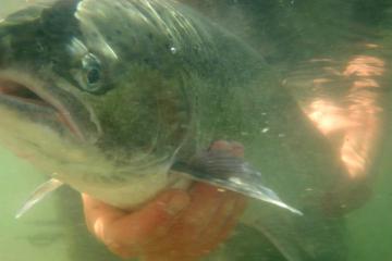As the fish comes in, keeping tension on the fly, grab the caudal peduncle (the back end of the body in front of the tail), keep a firm but easy grip on the peduncle and gently put your other hand under the fish but don't squeeze the belly as this can damage internal organs and affect survival. Then, remove the fly, keeping the fish in the water.