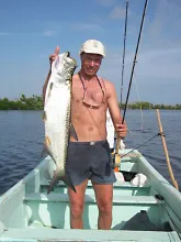 Opposite Lars Mathiessen. Lars had good luck... ehr... showed excellent skill with the big ones and was by far the angler in the company who hooked and landed most large tarpon in the open ocean. He also did fine on the babies, but with the big fish in the ocean he severely outfished the rest of us.
