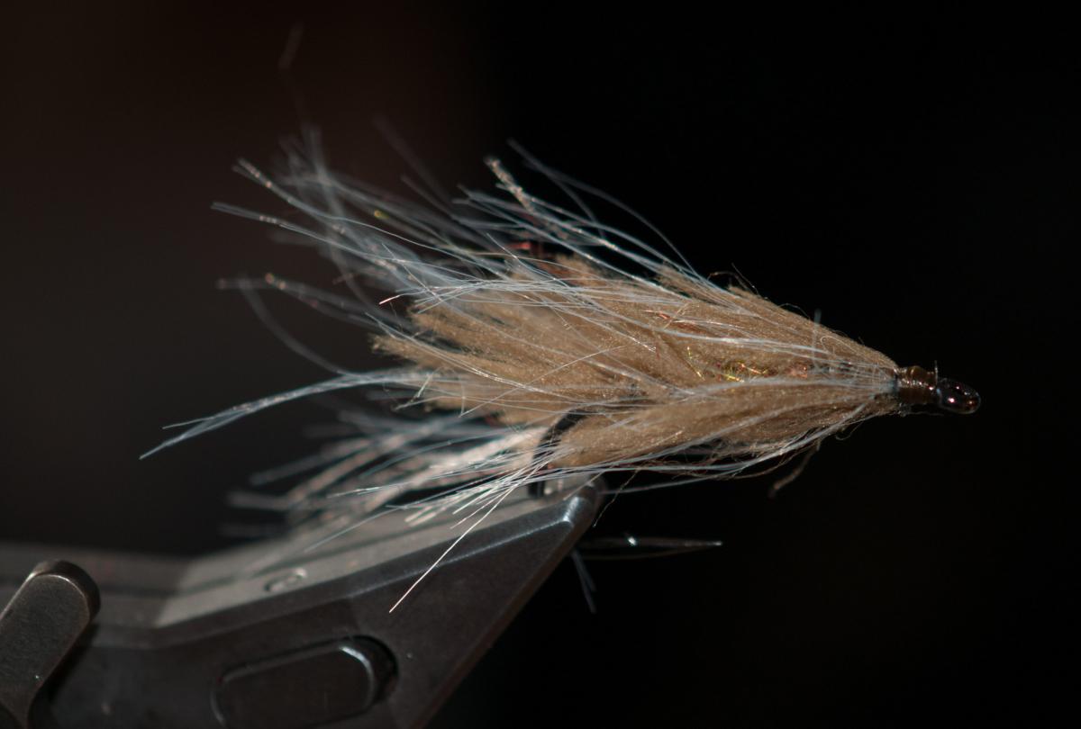 It's made from a combination of shorter, light olive furry bits and long, thin and fine white bits, all braided into a dark brown core. The combination simply reeks fly tying, and just wrapping this stuff on a hook would give you a pretty buggy looking streamer, easily useful for bass, trout, sea trout and a number of other fish. The resulting fly is fishy/shrimpy looking, and the fibers in the yarn are very mobile and light, creating something very living when moved in the water.
