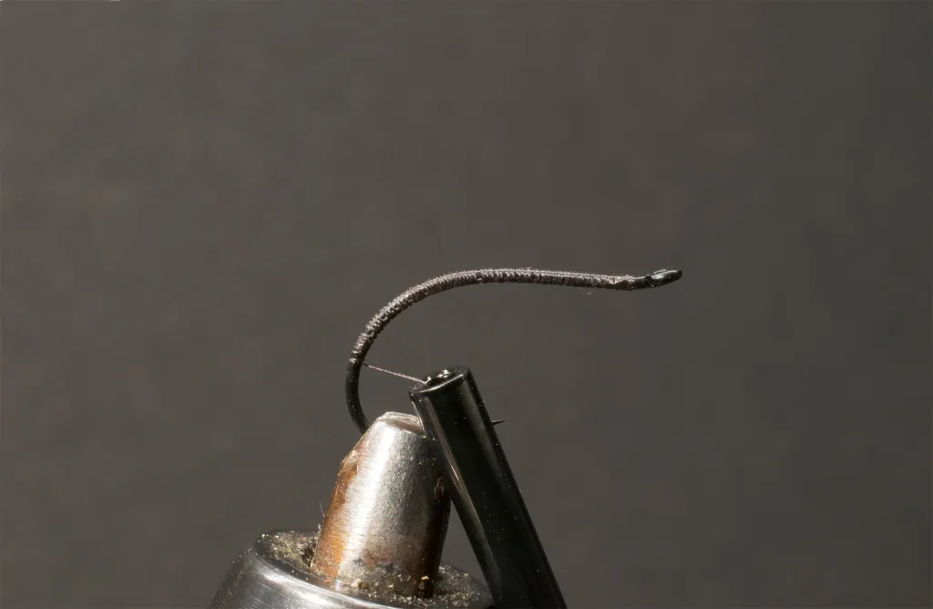 Use a light wire curved up-eye hook. Start the thread in the front and cover the hook shank.