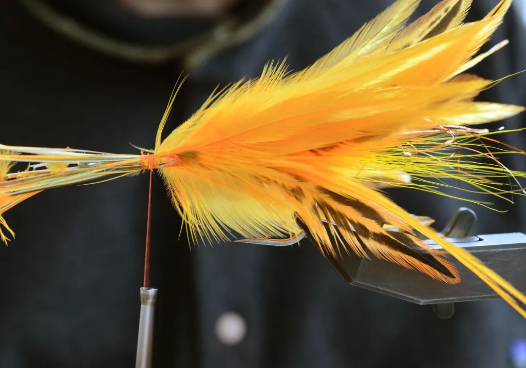 The last row of feathers should leave enough space on the hook shank for the eyes and head.